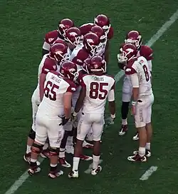 The first University of Arkansas football team was formed in 1894 and coached by John Futrall, who was a Latin professor at the university.[1] That team played three games: two against Fort Smith High School and one against Texas.[1] Before the 1909 season, the teams were called the Arkansas Cardinals and a bird was the school's mascot.[2] The name and mascot changed following the 1909 season when the football team, coached by Hugo Bezdek, finished 7–0.[3] The Cardinals became the Razorbacks after Arkansas defeated LSU 7–0, and coach Bezdek told a group of reporters after the game that his team played like a "wild band of Razorback hogs". The name stuck, and the student body voted to change the mascot.[4][5] The "Wooo Pig Sooie" or "Calling The Hogs" became a tradition and the official school cheer in the 1920s when farmers rushing out to meet the bus returning from an away game called the hogs as a greeting.[6][7][8] Arkansas prevailed over powerhouses Oklahoma, LSU and Washington University in St. Louis in 1909, and was declared unofficial champions of the South and Southwest.[1] It was with the help of Steve Creekmore that this was accomplished. Creekmore became perhaps the first Razorback star, a quarterback from Van Buren who initially played only intramurals.[1] Bezdek used Creekmore to install a very early edition of the hurry-up offense, as the team never huddled and chased the ball after every play.[1] Creekmore was also known for "fast and slippery running, blocking, and passing" and could also return punts and tackle well.[1]