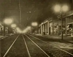 In 1919, San Francisco introduced tungsten bulbs on Van Ness Avenue, between Vallejo and Market Street, replacing gas mantles and arc lamps.[1] The city used two 250-candlepower tungsten lamps per column, on sixteen columns for every block.[1] According to The Electrical Review: “Under the old system of lighting it was dangerous for a pedestrian to attempt to cross the street because of the heavy automobile traffic. Now the entire street is flooded with evenly distributed light and the appearance of the street as well as the public safety has been greatly enhanced."[11]
