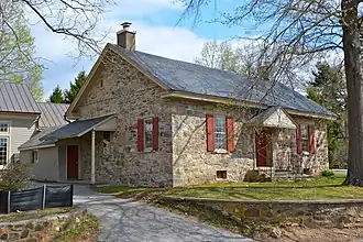 The meeting house was built in 1738 and enlarged in 1745.[4] In 1973 it was a one-story, white plastered stone building with a gable roof.[5] Photographs taken in 2014 show the plaster has been removed from the stone. It has a gable roof with projecting cornice and a crown moulding at the roof line. The other contributing buildings are a stable and a frame storehouse and a stone house dated to 1817. The contributing site is the cemetery.[5]