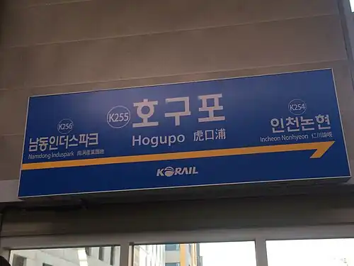 Hogupo Station (Korean: 호구포역) is a station on the Suin–Bundang Line as a part of the Seoul Metropolitan Subway system as of June 30, 2012. It is located in Nonhyeon-dong, Namdong District, Incheon.[1]