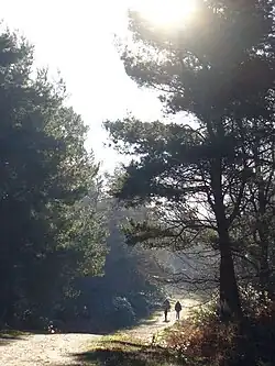 Holmbury St Mary is located inside the Hurtwood Forest,[4] which is considered the largest area of common land in Surrey; it takes up part of the Greensand Ridge which in turn contributes to the Surrey Hills AONB.[5] Nearby to the south is Holmbury Hill, which at 857 feet (261 m) is the fourth highest point in Surrey. The summit of Holmbury Hill, containing a hill fort and the Bray family memorial cairn, is the only part of the hill to be located in Holmbury, at the Ockley Estate.[6]