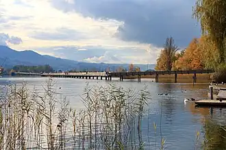 - The wooden bridge and the bridge chapel as seen from the nearby Seedamm, Wägital in the background