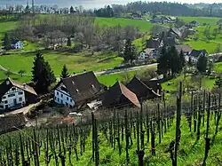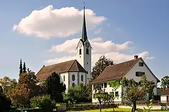 There are seven sites in Hombrechtikon that are listed as Swiss heritage sites of national significance. The houses in the town include; the Hof Oberhaus at Seestrasse 2&4, the Hürlimannhaus at Lützelsee 2&4, the Landstiz Rosenberg at Alte Landstrasse 1&3, the Menzihaus at Lützelsee 3 and the Eglihaus at Lutikon 1-3. The town's Reformed church is also on the list. The Neolithic and early Bronze Age settlement at Feldbach is the last site on the list. The entire hamlet of Lützelsee and the Feldbach area are part of the Inventory of Swiss Heritage Sites.[7] The prehistoric settlement Feldbach is part of the Prehistoric Pile dwellings around the Alps, a UNESCO World Heritage Site.[8]