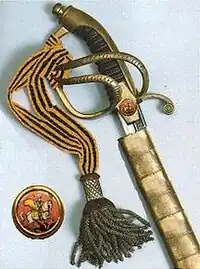 In pre-revolutionary Russia, not only Russian subjects were awarded weapons. For example, on the recommendation of Admiral Fyodor Ushakov, the Turkish captain Zeller was awarded a sabre decorated with diamonds worth 1,803 rubles. Statistics on such awards are not kept, as are the rather numerous awards of gold bladed weapons to Russian subjects on behalf of foreign sovereigns.[2]