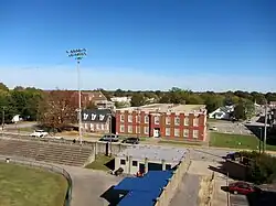 The athletic field, built in the 1930s as a Works Progress Administration project, is sited on the north side of the complex directly behind the main school building.[3] In 1965, the field was renamed in honor of William "Bill" Merner (1915–1965), a Hopewell High School graduate and Blue Devils football player who later returned to the school and coached the football team from 1949–1958.[18] The field features two goal posts, a metal scoreboard and concrete track and sidewalks. Concrete bleachers, believed to be built in the late 1930s, are on the east side of the field and modern, metal bleachers are on the west side. A concrete wall built in the late 1930s surrounds the perimeter of the field. It features capped pilasters approximately every six feet. A parking area is sited just north of the field.[3]