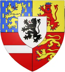 Arms of Rene of Chalons:Ecartelé: I et IV de Chalon-Orange; II et III contre-écartelé d'hermine et d'argent au lion de gueules armé et lampassé d'azur; sur-le-tout écartelé de Nassau et Vianden.