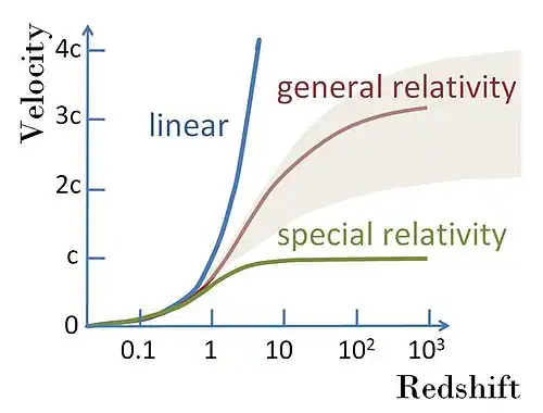 According to this approach, the relation cz = vr is an approximation valid at low redshifts, to be replaced by a relation at large redshifts that is model-dependent. See velocity-redshift figure.