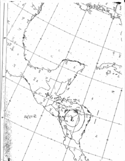 From its inception onwards, the depression exhibited a rather large wind field on satellite images and radiosonde data.[1] Its broad cloud pattern gradually coalesced, and by 0900 UTC on September 15, the NHC had determined it sufficiently strong to be upgraded to Tropical Storm Gert.[3] The center of the storm proceeded west-northwestward, moving ashore near Bluefields, Nicaragua, with winds of 40 mph (64 km/h) at 1800 UTC.[1][4] Gert's interaction with land impeded additional strengthening; the storm weakened back to a tropical depression just six hours after its landfall. While the storm's center remained land-bound for nearly two days, parts of its large circulation abutted the adjacent Caribbean and Pacific waters to draw in moisture and heat. As such, Gert retained its status as a tropical cyclone on its journey northwestward across the terrains of Nicaragua and Honduras.[1] In doing so, the storm consistently defied the NHC's forecasts for its imminent dissipation.[5][6]