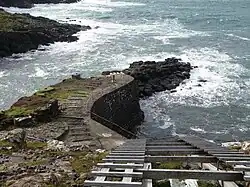 In 1924 the men from Hvalba wanted to improve the harbour even more, and a great work started. It was Jens Marius Poulsen from Skopun, who was in charge of the work on the stone harbour. The stone harbour is still in good condition. But rough seas have taken a part of the cliff away, so the men of Hvalba had to use concrete instead, where the cliff had been.