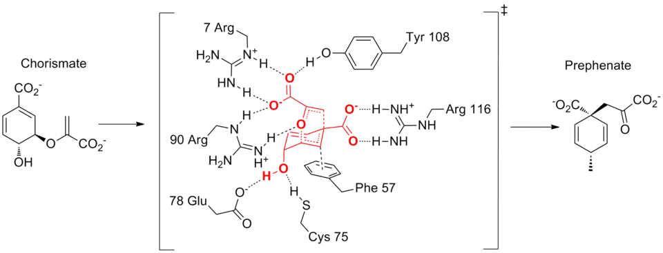 For instance, the natural enzyme chorismate mutase, which catalyzes the Claisen rearrangement of chorismate, features many other interactions in addition to the hydrogen bonds involved in stabilizing the enolate-like fragment, which is an example of the anionic fragment stabilization strategy discussed above.[17] A key interaction is the stabilization of the other cationic allyl fragment through a cation-pi interaction in the transition state. The use of many additional hydrogen bonds has several putative purposes. The stabilization of multiple hydrogen bonds to the enzyme helps overcome the entropic cost of binding. Additionally, the interactions help hold the substrate in a reactive conformation, and the enzyme-catalyzed reaction has near-zero entropy of activation, while typical Claisen rearrangements in solution have very negative entropies of activation.