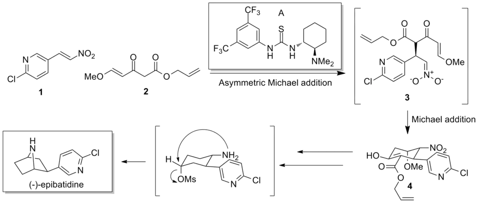 In 2008, Takemoto disclosed a concise synthesis of (−)-epibatidine that relied on a Michael cascade, catalyzed by a bifunctional catalyst.[31] After initial asymmetric Michael addition to the β-nitrostyrene, intramolecular Michael addition furnishes the cyclic ketoester product in 75% ee. Standard functional group manipulations and an intramolecular cyclization yields the natural product.