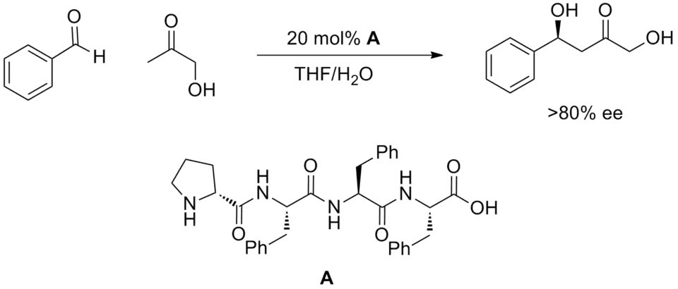 A relatively new strategy of using synthetic oligopeptides to perform catalysis has yielded many examples of catalytic methods.[20] Peptides feature multiple potential sites for hydrogen bonding and it is generally not understood how these engage substrate or how they promote reaction. Peptides have the advantage of being extremely modular and often these catalysts are screened in large arrays. Highly enantioselective reactions have been discovered in this manner such as the aldol reaction depicted below.
