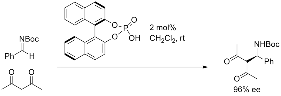 Asymmetric catalysis involving nearly complete protonation of substrate has been effective in Mannich reactions of aromatic aldimines with carbon nucleophiles.[15] In addition, aza-Friedel-Crafts reactions of furans, amidoalkylations of diazocarbonyl compounds, asymmetric hydrophosphonylation of aldimines and transfer hydrogenations have also been reported.[3] Chiral Brønsted acids are often easily prepared from chiral alcohols such as BINOLs, and many are already present in the literature due to their established utility in molecular recognition research.[16]