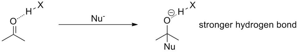 For example, in a typical acyl substitution reaction, the starting carbonyl compound is coordinated to the catalyst through one, two or possibly more hydrogen bonds. During the attack of the nucleophile, negative charge builds on the oxygen until the tetrahedral intermediate is reached. Therefore, the formally negative oxygen engages in a much stronger hydrogen bond than the starting carbonyl oxygen because of its increased negative charge. Energetically, this has the effect of lowering the intermediate and the transition state, thus accelerating the reaction.