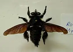 Hyperechia xylocopiformis is a species of robber fly found in India and Sri Lanka. Like other species of Hyperechia they mimic the Xylocopa species of carpenter bees.[2] [3] The type specimen was collected by Walter Elliot from Madras and described by Francis Walker. The larvae live in the nests of carpenter bees and feed on their larvae while adults prey on wasps and bees including carpenter bees.