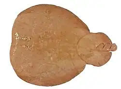 The pelvic fins are relatively large and merged with the pectoral fin disc at the front to form a roughly circular secondary disc. The two dorsal fins are shaped like rounded lobes and are located very close to the caudal fin, which is of similar size with a nearly symmetrical, rounded margin. The tail is extremely short,[11] such as that the caudal fin barely extends past the pelvic fin disc. The skin is entirely devoid of dermal denticles, and may be creased in areas. The dorsal colouration ranges from dark to reddish brown, to grayish, pinkish, or yellowish, and may be plain or sparsely patterned with irregular darker and lighter markings. The underside is pale, as are the spiracle papillae.[5][9] This species grows to a length of 70 cm (28 in), or possibly even 92 cm (36 in), though most are only around 40 cm (16 in) long.[6][9]