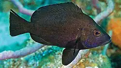 Hypoplectrus nigricans, the black hamlet, is a species of marine ray-finned fish, a sea bass from the subfamily Serraninae which is part of the family Serranidae, which also includes the groupers and anthias. It is native to shallow parts of the central Western Atlantic Ocean and Caribbean Sea.[3] It grows to about 15 cm (6 in) in total length. It is a simultaneous hermaphrodite, with a breeding strategy known as egg trading. One fish acts as a female and lays a batch of eggs which the other fertilises. The following night, the roles are reversed.