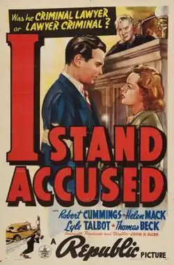 I Stand Accused is a 1938 American drama film directed by John H. Auer and written by Gordon Kahn and Alex Gottlieb. The film stars Robert Cummings, Helen Mack, Lyle Talbot, Thomas Beck, Gordon Jones and Robert Paige. The film was released by Republic Pictures.[1][2]