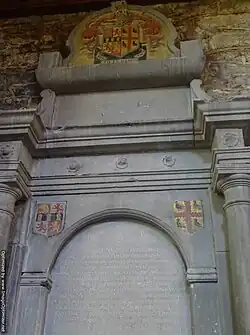 The arms of Sir Arthur Northcote, 2nd Baronet (1628–1688), sculpted on his ledger stone in King's Nympton Church, Devon, England, show a shield tierced per pale, the second (central) part showing his paternal arms of four quarters. The dexter part shows the arms of Walshe (six mullets 3:2:1), representing his first wife Elizabeth the daughter of James Walsh of Alverdiscot in Devon. The sinister part shows the arms of Godolphin (an eagle displayed double headed between three fleurs-de-lis), representing his second wife Elizabeth the daughter of Sir Francis Godolphin of Godolphin in Cornwall.