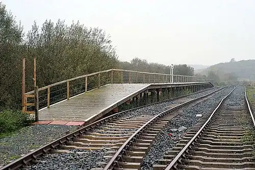 In 1983, Down District Council agreed to support the Downpatrick & Ardglass Railway (since renamed the Downpatrick & County Down Railway) in its efforts to rebuild part of the BCDR lines in and around Downpatrick for use as a heritage railway, starting with the South Line to the Loop Platform and Magnus Grave before moving on the North Line to a brand new halt at Inch Abbey.[4] The restored line follows the original BCDR route out of Downpatrick until shortly after it crosses the River Quoile, where it makes a sharp turn to the north-east to terminate closer to the Abbey itself. Work on the extension commenced in 1997, with Inch Abbey opening in 2005.[5]