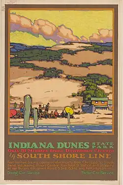 Indiana Dunes State Park by South Shore Line, 1927 BroadsideThe Nature Center is a year-round facility that has a wildlife observation window, library, and a large auditorium. An interpretive naturalist provides public hikes and programs.