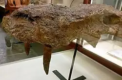 Other species belonging to distinct lineages were sometimes inadvertently classified in the genus Inostrancevia. For example, in 1940, Efremov classifies a gorgonopsian of then-problematic status as I. progressus. However, in 1955, Alexey Bystrow moved this species to the separate genus Sauroctonus.[42][43][12][44] A large maxilla discovered in Vladimir Oblast in the 1950s was also assigned to Inostrancevia, but the fossil would be reassigned to a large therocephalian in 1997,[45] and later designated as the holotype of the genus Megawhaitsia in 2008.[46]