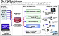 The Integrated Public Alert and Warning System (IPAWS) is the primary public warning system of the United States, implemented as a platform that unifies the Emergency Alert System, National Warning System, Wireless Emergency Alerts, and NOAA Weather Radio under a single architecture. IPAWS was designed to modernize these systems by enabling alerts to be aggregated over a network and distributed to the appropriate system for public dissemination concurrently.[1] IPAWS uses the Common Alerting Protocol (CAP) for message formatting and distribution.