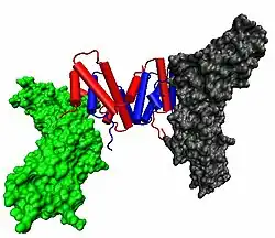 - ^ Thiel DJ, le Du MH, Walter RL, D'Arcy A, Chène C, Fountoulakis M, et al. (September 2000). "Observation of an unexpected third receptor molecule in the crystal structure of human interferon-gamma receptor complex". Structure. 8 (9): 927–936. doi:10.1016/S0969-2126(00)00184-2. PMID 10986460.