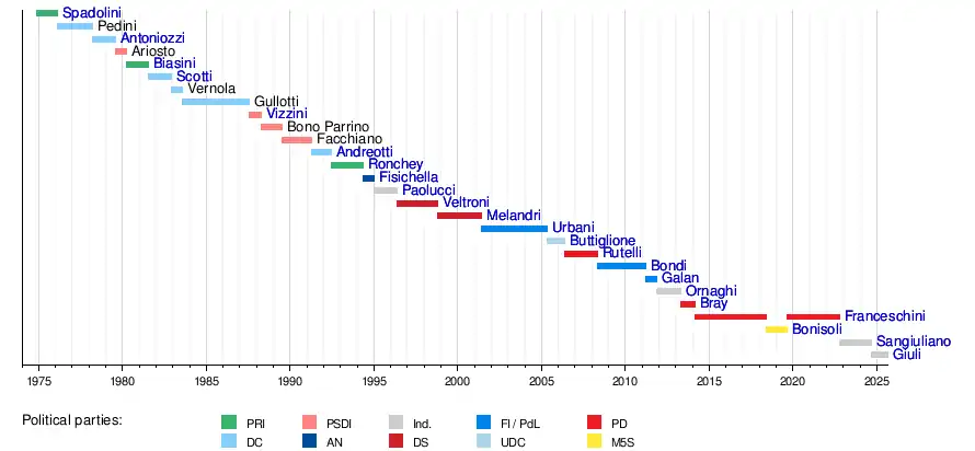 | Dario Franceschini (1958– ) | 22 February 2014 | 1 June 2018 | 4 years, 99 days | Democratic Party | Renzi Gentiloni | ||