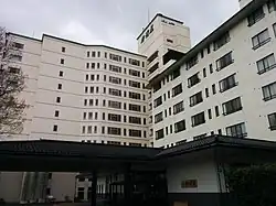 The hotel features Japanese, Western, and mixed style rooms for a total of 148 rooms with capacity for 600 guests. There are indoor and outdoor baths separated by gender, however there is also a private family bath available to rent for an additional fee. Changing rooms, sauna, and showers are also inside the bathing facilities. Other hotel facilities include a convention hall, banquet hall, special conference room, party room, conference room, karaoke salon, este and massage, bar, two restaurants, a noodle shop, gift shop, smoking room, and small-scale museum displays.[1] The hotel is located next to the 1,000 year old Hotel Sakan.