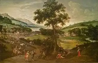 As was common practice in the Antwerp art sector, Jacob Grimmer often collaborated with other specialist artists. Collaborations with Marten van Cleve and Gillis Mostaert who painted the staffage in his landscapes are recorded.[7] Collaborations with Mostaert appear to have been particularly frequent. An example is a pair of landscapes representing 'Spring' and 'Winter', which may have been part of a cycle on the seasons (Auctioned at Sotheby's, London on 3 December 2008, lot 7). In this pair of paintings the artists depict everyday life by filling every corner with some anecdotal detail. They and their workshops repeated these compositions on several further occasions and numerous smaller repetitions, of varying degrees of quality, are known.[14]