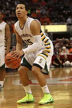 On September 8, Brunson announced that he would be curtailing his recruitment and making his decision between Illinois and Villanova on September 10.[28] On that date, Brunson committed to Villanova.[25][29][30] At the time of his decision, he was ranked as the number one point guard in the national class of 2015 by Scout.com.[24] Stevenson was a preseason top-10 team in the MaxPreps national high school rankings.[31] A lot was expected of Brunson's team after losing to teams led by Parker and Okafor in the IHSA tournament final four in 2013 and 2014 even though no team from Lake County has ever won a state basketball championship.[10] The team rattled off 11 straight victories to start the season before losing 88–81 to Chaminade Prep and its star Jayson Tatum in the Cancer Research Classic in Wheeling, WV, despite 48 points from Brunson.[32][33][34] On January 17, Brunson and Stevenson faced Derryck Thornton, Jr. and Findlay Prep at the Hoophall Classic. At the time, Brunson was the number 3 ranked point guard in the class of 2015 and Thornton was the number 2 ranked point guard in the class of 2016 for the number 1 team in the country according to USA Today.[35] Findlay, who was led by Arizona signee Allonzo Trier's 27 points, held Brunson to 26 in the second loss of the season for Stevenson,[36] who had been 15–1.[37] On January 28, he was named to the 2015 McDonald's All-American Boys Game roster,[38] becoming the second player from Lake County to earn such recognition.[39] On February 2, he was named to the 11-man Team USA for the Nike Hoop Summit.[40] On February 21, Stevenson lost to Simeon as Brunson posted 25 points on 9–24 shooting, ending a 22-game in-state streak in a game that featured the top two teams in the state.[41] The Simeon frontline featured three Big Ten Conference signees: D. J. Williams (Illinois), Ed Morrow (Nebraska) and Isaiah Moss (Iowa).[42] On March 5, he was named to the Jordan Brand Classic roster.[43]