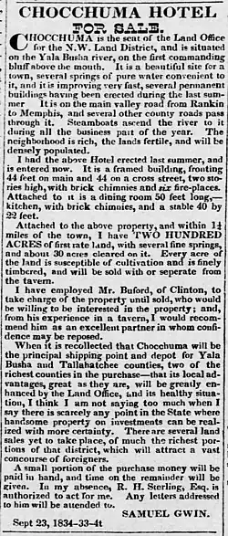 The sale of public land at the Chocchuma land office was ultimately investigated by the U.S. Congress, "which revealed that although members of Congress, the chief justice of the Court of Appeals of Mississippi, and the federal marshal were present, no one could recall that the provisions of the Act of 1830 had been read, as required by the instructions of the Commissioner of the Land Office, or that there had been protests against the clearly illegal actions of the combinations. It was also brought out that the register, Samuel Gwin, had left his office to buy some tracts and had resold them immediately at a 33 percent profit to settlers, but the only unusual feature of his conduct is that he was induced to admit his dereliction."[15]