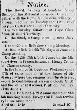 He joined the Methodist Conference in 1802, at Sumner county, Tennessee. He organized what was called the Barren Circuit in Kentucky. Beginning in 1807 he traveled in company with William McKendree and preached at camp meetings in Illinois and Missouri, which were then "but thinly settled."[4] Methodist historian McFerrin described him as "commanding, being more than six feet in height, and in his later years he weighed over two hundred pounds...and his voice unsurpassed for strength and sweetness...His early educational opportunities were limited, but he was a great student of nature, and had wonderful fluency of speech. His sermons were not remarkable for order or symmetry, nor did they show much familiarity with the classics or scholastic divinity; but he was well-versed in the Scriptures, and had studied the human heart; hence his discourses were direct, and oftentimes eloquent and powerful...Said a young minister, who was his colleague in Nashville, while Mr. Gwin was pastor there, 'Brother Gwin, how is it that you are ever prepared to preach? You seem to be seldom in your study, and scarcely ever read.' 'O my son,' replied Mr. Gwin, 'you do not understand it: you preachers of your class have to read and study books to master your subjects, but I know what the books are made of before they are printed.'"[6]