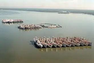 The James River Reserve Fleet (JRRF) is located on the James River in the U.S. state of Virginia at (37°07′13″N 76°38′47″W / 37.120393°N 76.646469°W) near Fort Eustis. James River Reserve Fleet, a "ghost fleet", is part of the National Defense Reserve Fleet. The Reserve Fleet ships in storage, called "mothballed", that can be ready for use if needed. Many are awaiting scrapping due to the age or condition of the ship. Some ships are used for target practice or as artificial reefs. A few ships became museum ships and other sold to private companies. Ships can be readied for use in 20 to 120 days during national emergencies or natural disaster. [1][2][3] The U.S. Department of Transportation's Maritime Administration (MARAD) provides oversight of the James River Reserve Fleet. For the United States Navy ships the United States Navy reserve fleets stored these ships and submarines.[4]