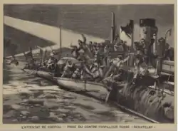 The Japanese quickly learned of Reshitel‘nyi′s presence at Chefoo and issued orders to Japanese forces to disregard any disarmament and either capture or sink her.[10] As Reshitel‘nyi′s crew was disarming her, Asashio and Kasumi entered the port.[9][10][11] According to the Russian account of the ensuing incident, a Japanese boarding party from the destroyers went aboard Reshitel‘nyi at 03:00 on 12 August, and the officer commanding the boarding party demanded that Reshitel‘nyi either surrender or put to sea within two hours and fight the Japanese destroyers in international waters.[10][12] Roschakovsky rejected the Japanese demands, arguing that he was disarming his ship for internment in accordance with international law, that the Japanese demands violated Chinese neutrality, and that in any event Reshitel‘nyi could not get underway due to engine problems.[10] The Japanese officer countered that Chinese neutrality did not protect Reshitel‘nyi, claiming that the Battle of the Yellow Sea had not yet ended because Russian ships still were in the process of fleeing the engagement and that Japan had a right to hot pursuit of Russian ships even in neutral waters under those circumstances.[10] As the argument continued, the Japanese attempted to hoist their flag aboard Reshitel‘nyi, and Roschakovsky threw the Japanese officer overboard.[12] Roschakovsky was dragged over the side as well, and the Japanese fired shots at him in the water as he attempted to get back aboard his ship.[12] Hand-to-hand combat between Russian and Japanese sailors ensued while Reshitel‘nyi′s crew set off an explosive charge in an attempt to destroy her by detonating her ammunition magazine, but the magazine did not explode and the Japanese succeeded in capturing her after about half the Russian crew and half the Japanese boarding party had been thrown overboard.[10][12] During the skirmish, two Russians were killed and four, including Roschakovsky, were wounded, while the Japanese lost two men killed and 11 wounded.[12] The men in the water eventually swam ashore,[12] and the Japanese, ignoring the protests of the senior Imperial Chinese Navy officer at Chefoo, towed Reshitel‘nyi to Dalniy, China, as a prize.[10][12]