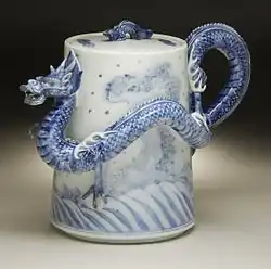 It is usually, but not always,[31] possible for an expert to tell from the object itself whether it was made for the domestic market or export. Some shapes are certainly European, including shaving-bowls with a crescent-shaped cut-out for the neck,[32] coffee pots and other shapes based on European silverware shapes,[33] "apothecary bottles",[34] bottles in imitation of European glass shapes,[35] and others. Some pieces were shipped to Europe as plain "blanks", and given overglaze decoration there, usually in Holland,[36] or given metal mounts in Europe; these may even be dated, which is especially useful for historians.[37] Many export ewers were given holes at the top of the neck to facilitate the mounts, but were never mounted.[38]