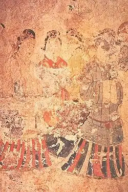 The earliest surviving paintings from this period include the murals on the interior walls of the Kondō (金堂) at the temple Hōryū-ji in Ikaruga, Nara Prefecture. These mural paintings, as well as painted images on the important Tamamushi Shrine include narratives such as jataka, episodes from the life of the historical Buddha, Shakyamuni, in addition to iconic images of buddhas, bodhisattvas, and various minor deities. The style is reminiscent of Chinese painting from the Sui dynasty or the late Sixteen Kingdoms period. However, by the mid-Nara period, paintings in the style of the Tang dynasty became very popular. These also include the wall murals in the Takamatsuzuka Tomb, dating from around 700 AD. This style evolved into the Kara-e genre, which remained popular through the early Heian period.
