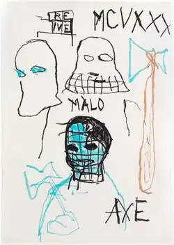 A poet as well as an artist, words featured heavily in his drawings and paintings, with direct references to racism, slavery, the people and street scene of 1980s New York, black historical figures, famous musicians, and athletes, as his notebooks and many important drawings demonstrate.[142][143] Often Basquiat's drawings were untitled, and as such, to differentiate works, a word written within the drawing is commonly in parentheses after Untitled. After Basquiat died, his estate was controlled by his father Gérard Basquiat, who also oversaw the committee that authenticated artworks, and operated from 1994 to 2012 to review over 2000 works, the majority of which were drawings.[144]