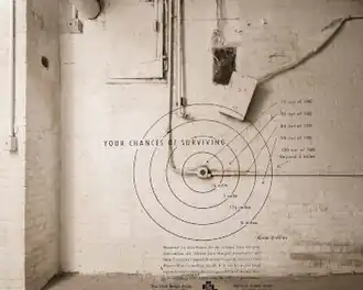 In two photo essays, Michna-Bales explored existential threats, past and present. Fallout (2013–22) documented intact, hidden or underground nuclear fallout shelters in fourteen cities—as well as related propaganda—left behind by the Cold War generation, through photographs, declassified government documents and old newspaper articles.[6][13] The shelters—many still containing canned food and furniture—were endorsed by official civil defense programs despite being largely placebos, a fact made evident in chilling official documents detailing casualty estimates.[6][35][36] Reviews described Michna-Bales's unpopulated images as quiet studies in architecture that served as "haunting time capsules" revealing the era's sense of dread and instability.[35][6] In 2021, the project was paired with another by photographer Adam Reynolds documenting U.S. nuclear missile silos in a six-museum traveling exhibition, "Two Minutes to Midnight and the Architecture of Armageddon" (2021–6),[13] which formed the basis of their Countdown (2022) book.[37][36]