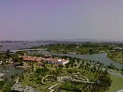 An aerial view of Jimei District (foreground and center), connected by numerous bridges with Xiamen Island's Huli District (in the background right, including Xiamen Gaoqi International Airport).