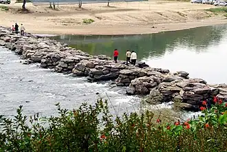 The piers are 1.2 m thick and the span between the piers is 80cm.[3] Originally there were 28 channels for the water to flow between the piers, but over time, some piers and channels were destroyed,[5] and a project to restore the 24 channels to the original 28 channels was started in 2008, and completed in 2018.