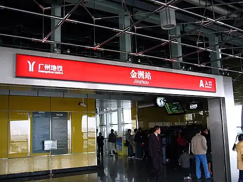 Jinzhou Station (Chinese: 金洲站; Cantonese Yale: Gāmjāu Jaahm) is an elevated station of Line 4 of the Guangzhou Metro. It started operations on 28 June 2007 and served as the southern terminus of Line 4 until the extension to Nansha Passenger Port. It is located at the junction of Shuangshan Avenue[1] and Guangfeng Road[2] in the town of Huangge, Nansha District.[3][4][5]