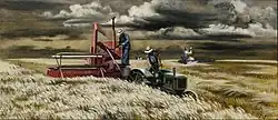 In August 1935, Jones painted a mural series at the Commonwealth College at Mena, Arkansas.[3] Jones painted a New Deal mural for the post office in Charleston, Missouri, titled Harvest in 1938. This mural was done at the height of Jones' fame and is a classic subject for Jones. It depicts the harvest of wheat in a very labor-intensive manner showing the cutting, gathering, and stacking of it onto a wagon. Under a cloudy dark sky, wheat dominates the perspective with the farmers providing a great deal of motion. Another New Deal mural entitled Men and Wheat was painted by Joe Jones in 1940, followed by Husking Corn in 1941 for the Dexter, Missouri, post office, Turning a Corner in 1939 in Anthony, Kansas and Threshing in Magnolia, Arkansas, in 1938. All the murals depicted some process during a wheat harvest. Of the "revolutionary element" his early work, Jones wrote to Green, it is "not warped to bias to any party" except for the "militant struggle of the working class," which he contrasted to artists who believed in the Communist Party.[3]