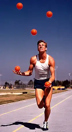 Joggling is a competitive sport that combines juggling with jogging. People who joggle are called jogglers.[1]
