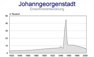 Johanngeorgenstadt (German pronunciation: [ˌjoːhan.ɡeˈɔʁgŋ.ʃtat] ⓘ, lit. 'John George Town') is a mining town in Saxony’s Ore Mountains, 17 km south of Aue, and 27 km northwest of Karlovy Vary. It lies in the district of Erzgebirgskreis, on the border with the Czech Republic, is a state-recognized health resort (Erholungsort), and calls itself Stadt des Schwibbogens (“Schwibbogen Town”). Its population decline since the 1950s has been extremely severe, falling from 45,000 residents in 1953 to only about one twelfth of that now.