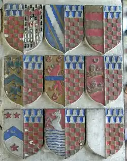 He married Gertrude Courtenay, a daughter of Sir William III Courtenay (1477–1535) "The Great",[5] of Powderham, Devon, MP for Devon in 1529, thrice Sheriff of Devon, in 1522, 1525-6, 1533-4, an Esquire of the Body to King Henry VIII, whom he accompanied to the Field of the Cloth of Gold.[6] He was 6th in descent from Hugh Courtenay, 2nd Earl of Devon (died 1377), and his own grandson William Courtenay (1527–1557) of Powderham became himself de jure 2nd Earl of Devon under the 1553 creation of that title. The arms of Courtenay quartered with Redvers appear amongst the many heraldic escutcheons shown on Chichester's monument in Pilton Church. He had by her seven sons and nine daughters,[7] who married into many of the leading gentry families of Devonshire, two of them marrying children of first cousins of Lady Jane Grey (1536/1537-1554), The Queen of Nine Days.[8] The marriages of his children are represented heraldically on a panel on his monument in Pilton Church.
