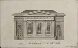 From 1823 to 1862, he served as the pastor of Union Chapel in Brighton, East Sussex, succeeding John Styles.[3][4][8][9][10][11] The chapel had been enlarged during Styles's 15-year incumbency,[2] and immediately grew in popularity when Goulty took over. Its earlier debts of £1,000 were settled, and in 1825 the chapel was redesigned in Classical style with Greek Revival and Egyptian Revival elements.[2] The exterior was designed on a "grand scale", as was its interior: below a domed ceiling ran a deep balcony supported on ornate iron columns.[12] The architect has been the subject of much disagreement: Amon Wilds is usually credited, but Charles Busby produced and signed an architectural design in 1825 and the men probably worked together on it.[2][12]