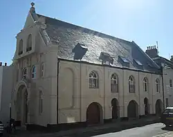 His particular interest was improving education in the town:[13] he founded, and served 31 years (1835–1866) as Secretary of the Board of Governors to, the Brighton Union Charity School in Middle Street (now the Middle Street Primary School) in Brighton;[4][13] and in 1828 together with John Russell, 1st Earl Russell (1792–1878) he founded and served as honorary secretary of the Royal British School on Eastern Road.[4][15] In 1847, at the bottom of West Street on the seafront, he founded a school for the children of fishermen and an Independent preaching station called the Bethel Arch, at which he ministered to the fishermen themselves.[16] The 1851 religious census confirmed that the chapel was "also used as a Day School" and had a capacity of 250 seats and standing room for an additional 50 worshippers. Goulty, who signed the census return, recorded 280 attendees at afternoon and evening services, and wrote that "the place is generally full ... [there are] many stragglers at the Door on the Beach".[8] In the same census, Goulty recorded the capacity of Union Chapel as 900 seats and standing room for 100 more, and the morning and evening attendance as 574 and 300 respectively.[8] A third Independent chapel associated with Goulty was the Hove Chapel in the neighbouring town of Hove. Founded in 1824 and with a capacity of 100, it was served by "local preachers" but was registered in Goulty's name. Attendance on census evening was 80.[17] The chapel does not survive and its location is not known, although it may have been associated with a Presbyterian meeting house registered in 1779 "in or near Hove Street".[18] Goulty was also instrumental in establishing the Henfield Congregational Church in 1832[19] with the financial assistance of Union Chapel, Brighton. The church was re-named "Henfield Evangelical Free Church" in 1961 and remains an active congregation situated in the original building on High Street, Henfield.