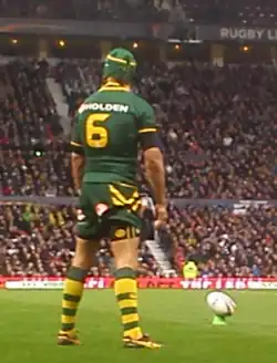 On 12 February 2011, Thurston was again selected for the Indigenous All Stars team for the NRL All Stars match at Cbus Super Stadium, playing at halfback in the 28–12 loss.[69] In the 2011 Anzac Test against New Zealand, Thurston played at halfback and kicked 2 goals in Australia's 20–10 victory at Cbus Super Stadium.[70] In Game 3 of the 2011 State of Origin series, Thurston suffered what at first appeared to be a horrific anterior cruciate ligament (ACL) knee injury, in the second half of the 34–24 series win at Suncorp Stadium.[71] Thurston, who had to be driven off the field on the Medi-Cab initially feared he would be out for the rest of the season, however early prognosis claimed that with immediate surgery, he could be back by Round 25, and in time for a possible Cowboys finals appearance. At the time of his injury, Thurston was leading the Dally M Medal ladder by two clear man-of-the-match performances (six points ahead of nearest rival Kieran Foran). After having scans the following day it was discovered that Thurston would miss 5–6 weeks and would have to wear a leg brace after the scans showed he had suffered a grade two medial ligament damage but would not require surgery.[72][73][74] This was the 21st consecutive Origin match played by Thurston since his debut in Game I 2005, breaking one of his teammates' records in Cameron Smith who played 19 consecutive Origins from his debut in Game III 2003. Thurston later returned for the Cowboys in Round 23 against the Brisbane Broncos at Dairy Farmers Stadium, The Cowboys were defeated 34–16 in Broncos legend Darren Lockyer’s record breaking 350th career match.[75] The Cowboys made the finals finishing 7th on the ladder before getting destroyed by the Manly-Warringah Sea Eagles in the second half in the 42–8 loss after leading 8–0 at half time at the Sydney Football Stadium.[76] Thurston played in 19 matches, scored 10 tries and kicked 61 goals for the Cowboys in the 2011 NRL season. In the post-season, Thurston travelled with the Australian national team to England for the 2011 Four Nations tournament, where he starred in all four games for Australia. Thurston picked up man of the match honours on three occasions whilst in the U.K, including the final in which Australia won 30–8 at Elland Road.[77] Thurston tallied 52 points during the tournament, scoring 3 tries and converting 22 goals from 25 attempts. Thurston was rewarded for a fantastic 2011 season with the Golden Boot Award.[78]